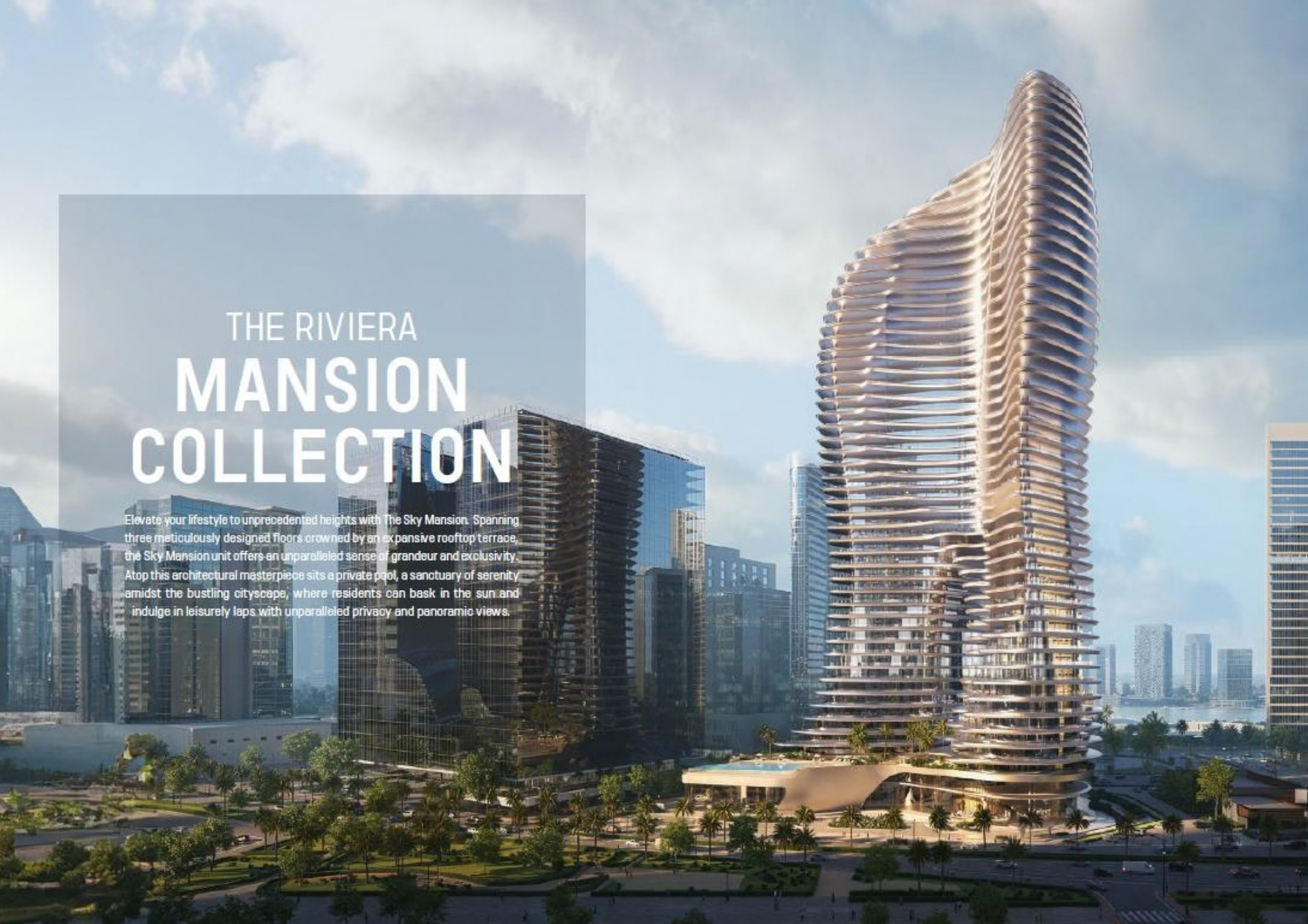 Resort-Style FacilitiesRiviera-inspired private beach; Infinity swimming pools; Private terrace pools in select residences; Landscaped podium decks; Outdoor relaxation areas